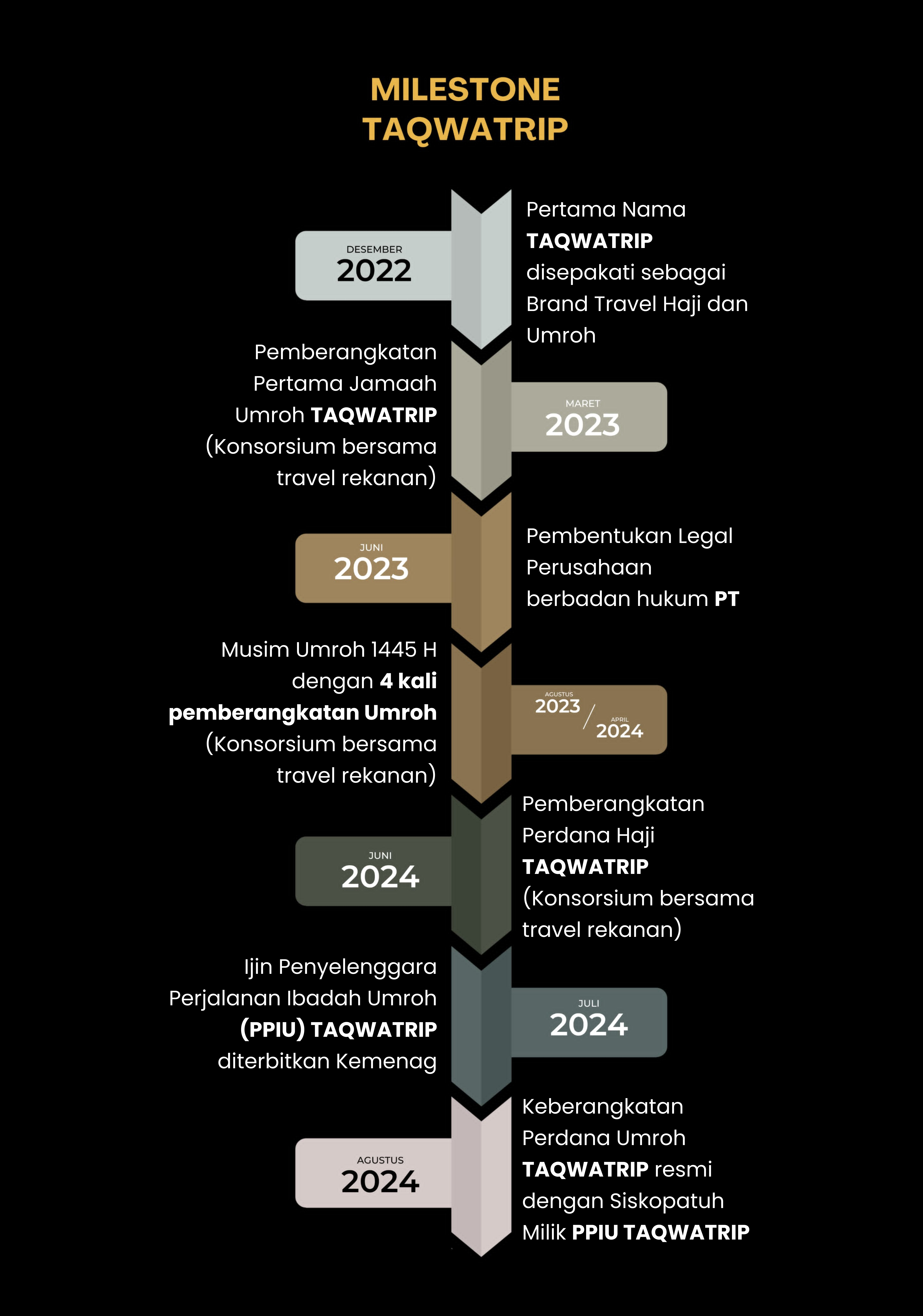 Para founder TAQWATRIP telah memberangkatkan ribuan jamaah sejak 2010 dengan berbagai "kendaraan" yang berbeda. Berulang kali Allah memudahkan perjalanan kami dalam melaksanakan ibadah umroh dan haji. Kini, saatnya kami berikhtiar untuk membantu memudahkan orang lain. Sejak 2022, kami berkumpul membentuk sebuah perusahaan sebagai wujud rasa syukur atas nikmat Allah yang telah diberikan serta sebagai bentuk kepedulian kami bahwa ibadah umroh dan haji bukan sekadar ritual fisik, tetapi juga memiliki esensi mendalam. Jamaah perlu memahami bahwa ibadah ini dapat menjadi titik awal perubahan besar dalam kehidupan, membimbing mereka menjadi pribadi yang lebih ber-TAQWA.